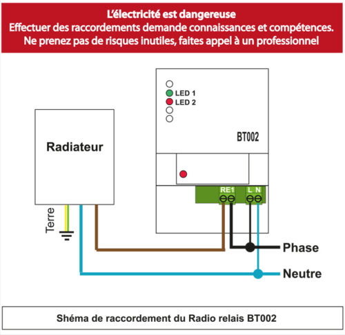 Le radio relais BT002 est piloté par un thermostat sans fil BT010 ou PH-ET7-V. Il fonctionne comme un interrupteur qui “obéit” au thermostat.